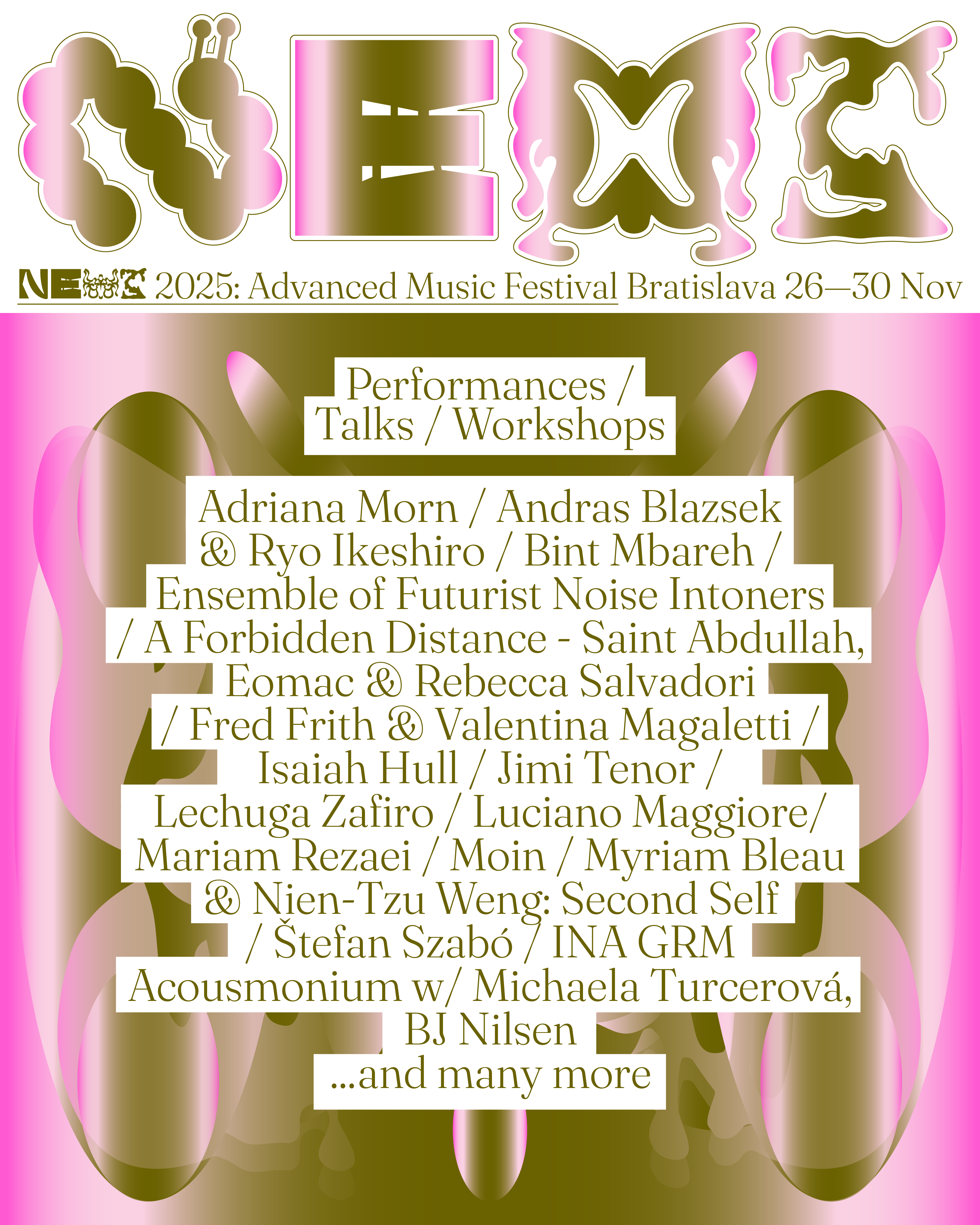 NEXT je to laboratórium, výstavisko aj skúšobný priestor pre nové spôsoby počúvania a vnímania sveta. Festival aj tento rok prinesie svetové premiéry, spolupráce a originálne objednávky, ktoré posúvajú hranice hudobného umenia.