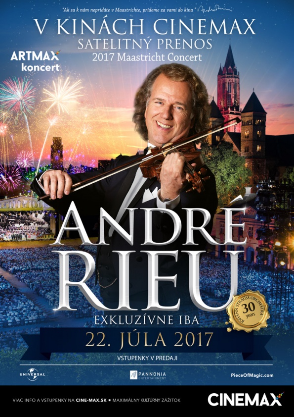 Kulisou koncertu bude znovu prekrásne stredoveké námestie v Andrého rodnom meste Maastricht. Práve tam aj tento rok vystúpi šesdesiatčlenný Johann Strauss Orchestra, jeho vynikajúci tenori, sopranistky a špeciálni hostia. Koncert Andrého Rieu je prísľubom nezabudnuteľného hudobného zážitku plného humoru, zábavy a emócií pre divákov všetkých vekových skupín. Exkluzívne v kinách uvidia diváci naviac zákulisné rozhovory so samotným Andrém.