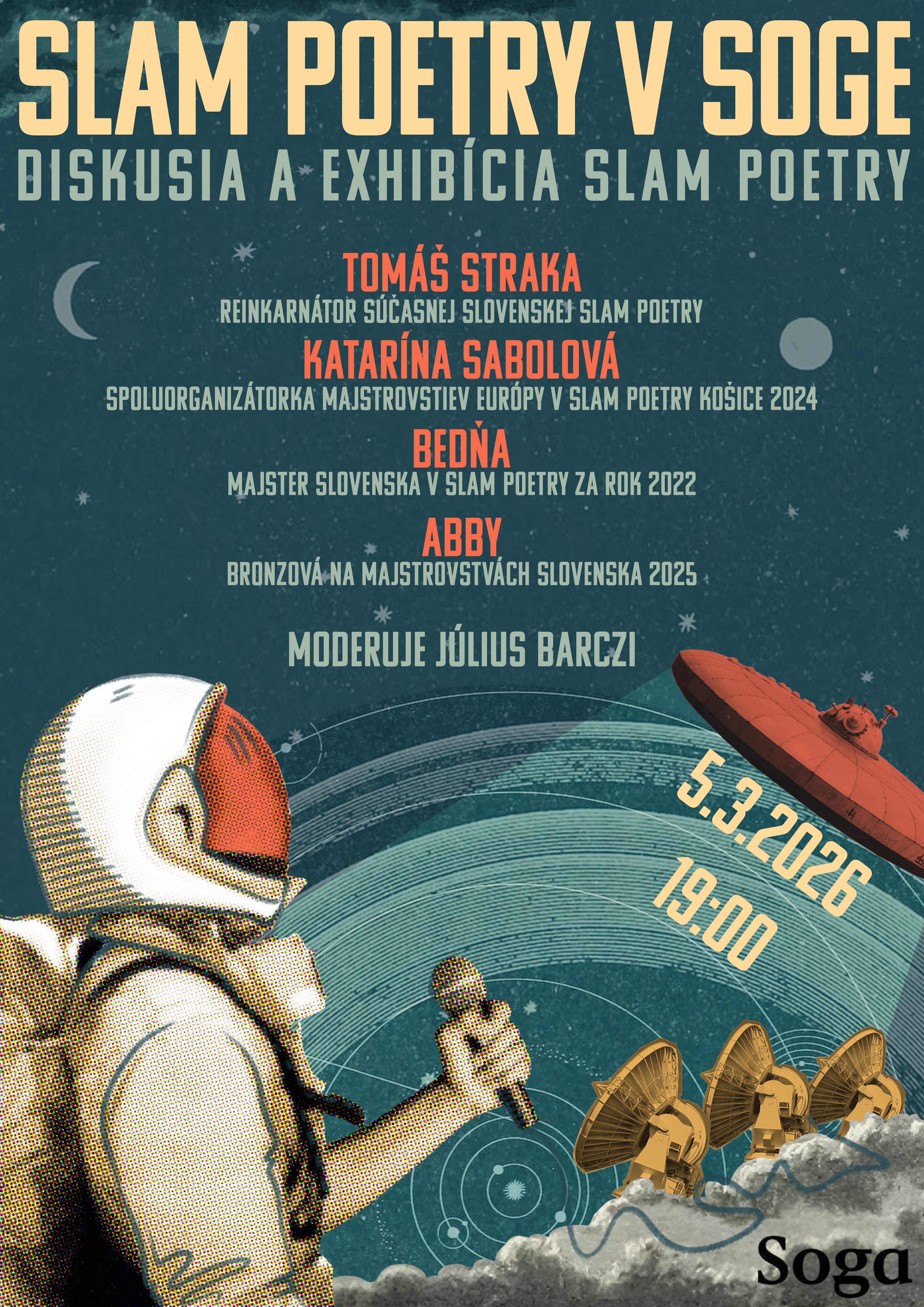 V slamovej diskusii 5. marca o 19.00 vystúpia, spoluorganizátorka Majstrovstiev Európy v Slam Poetry Košice 2024 Katarína Sabolová, majster Slovenska v Slam Poetry za rok 2022 Bedňa, tretia v umiestnení na Majstrovstvách Slovenska v Slam Poetry 2025 Abby a reinkarnátor súčasnej slovenskej Slam Poetry Tomáš Straka.