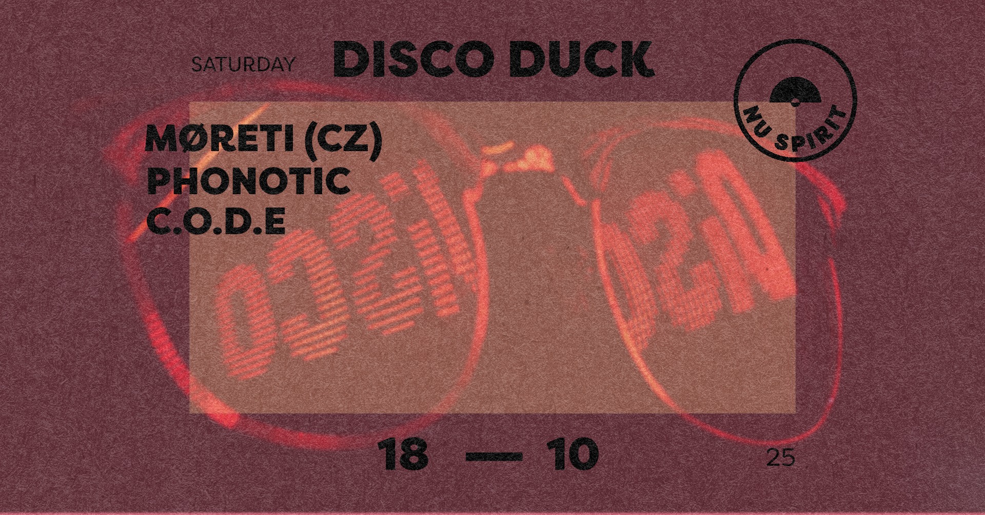 party Disco Duck discohouse Disco Duck je párty, kde sa hrá prevažne disco a house a každý DJ si v týchto žánroch nájde hudobnú polohu, ktorá mu je najbližsia. Tentokrát s DJmi Møreti (CZ) & Phonotic & C.O.D.E.