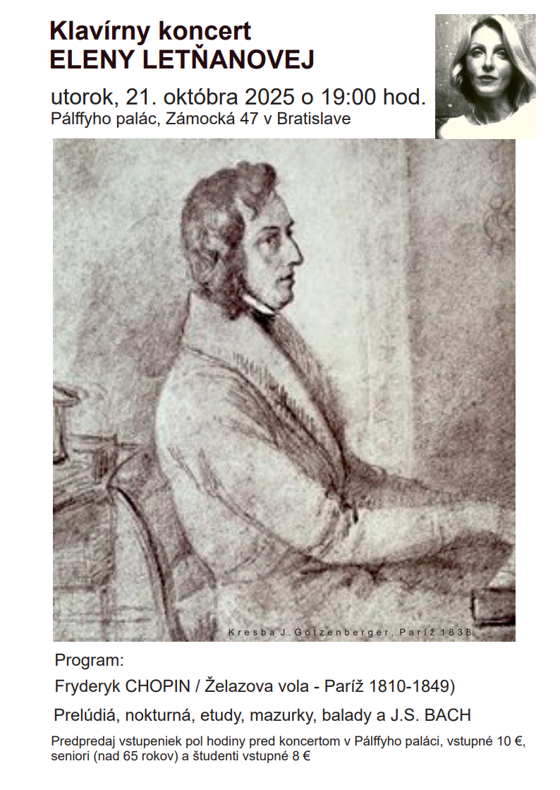 Klavírny koncert, na ktorom zahrá medzinárodne uznávaná klaviristka, publicistka a univerzitná pedagogička Elena Letňanová. Večer bude venovaný dielu Fryderyka Chopina - "Želazova vola".