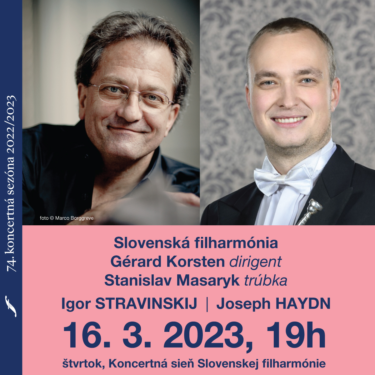 V interpretácii Stanislava Masaryka si vypočujeme Haydnov Koncert pre trúbku a orchester Es dur, Hob. Vlle:1, jediný Haydnov koncert pre tento nástroj, ktorý skomponoval pre Antona Weidingera, vynálezcu trúbky s ventilmi. Haydn počas svojho života skomponoval viac ako 1000 diel, medzi ktoré patrí aj 104 symfónii. Na programe štvrtkového koncertu zaznie jeho Symfónia č. 8 G dur Le soir (Večer), Hob. I:8. Koncert otvorí Suita z baletu Pulcinella Igora Stravinského. Balet vznikol na objednávku Sergeja Ďagileva. Od jeho parížskej premiéry, s kostýmami od Pabla Picassa, uplynulo už viac ako 100 rokov. V Koncertnej sieni zaznie suita z tohto pôvabného diela.