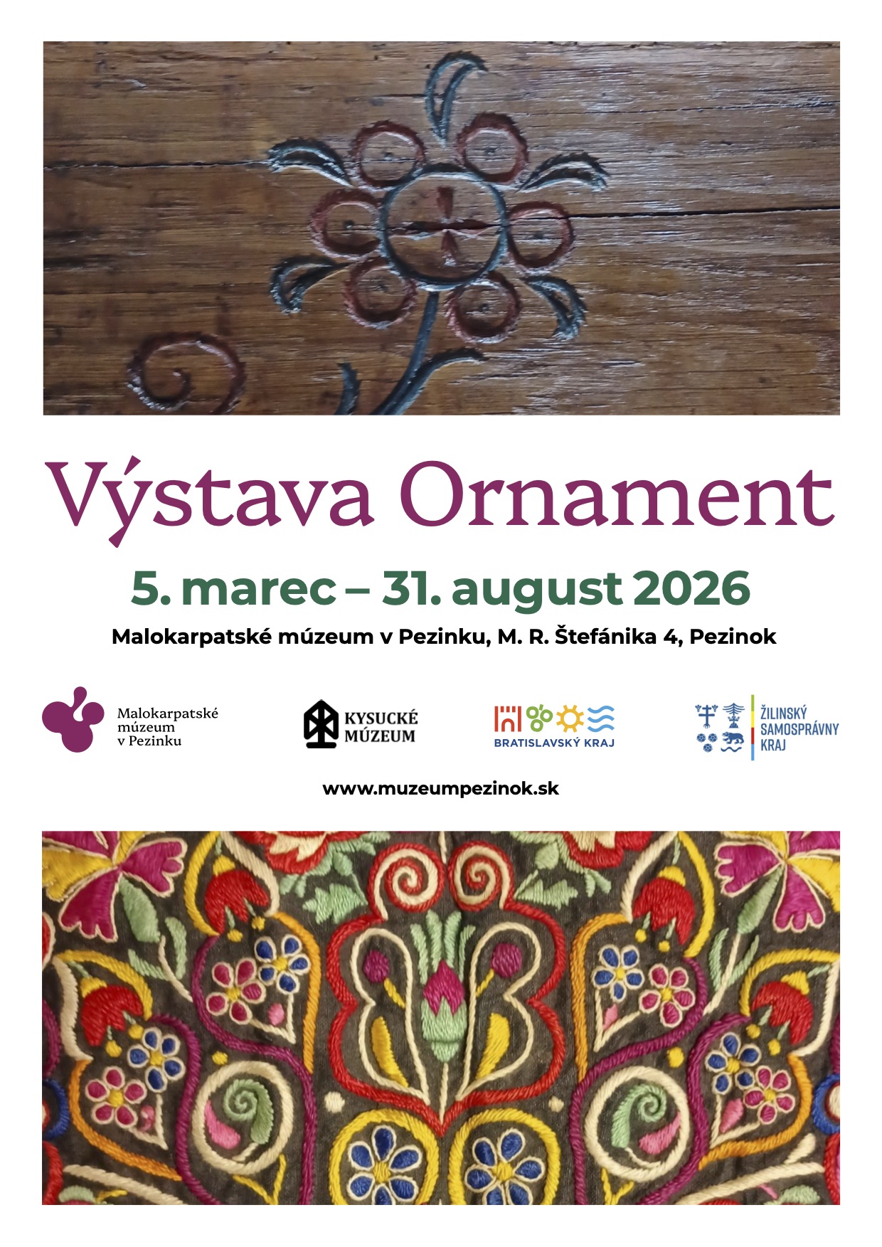 Ornament v ľudovej tradícii vystupuje ako médium pamäti, ako jemná hranica medzi sakrálnym a profánnym svetom, odkrýva to, čo je neviditeľné, ale iba tušené. Výstava otvára dynamický priestor medzi svetom stredného a západného Slovenska, ľudového výtvarného prejavu, priestor, ktorý má mnohé spoločné archaické prvky, znaky, symboly a ukazuje aj odlišné regionálne veľmi špecifické prvky.